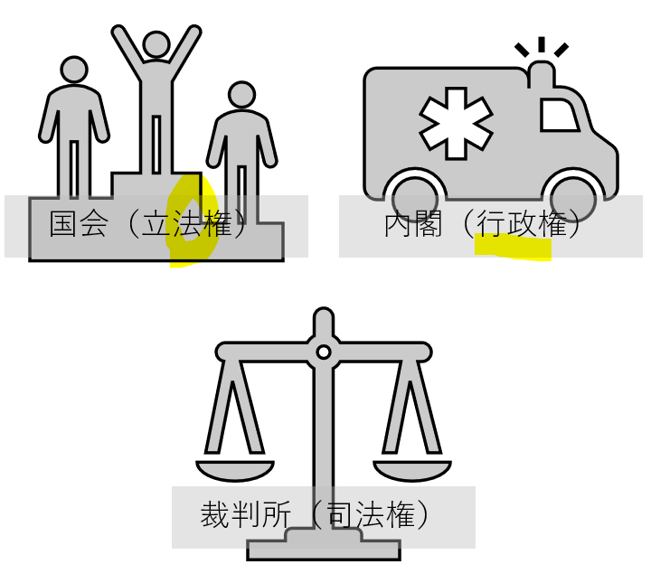 国家作用を3つの権利に分類してみると「立法権」は各種法規を制定する国会「司法権」は裁判所と明確にすることができますが、
