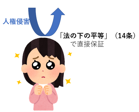 たとえば平等権侵害が起これば「法の下の平等」が私たちを直接守ってくれます。これが直接的に守られる人権のイメージです。
