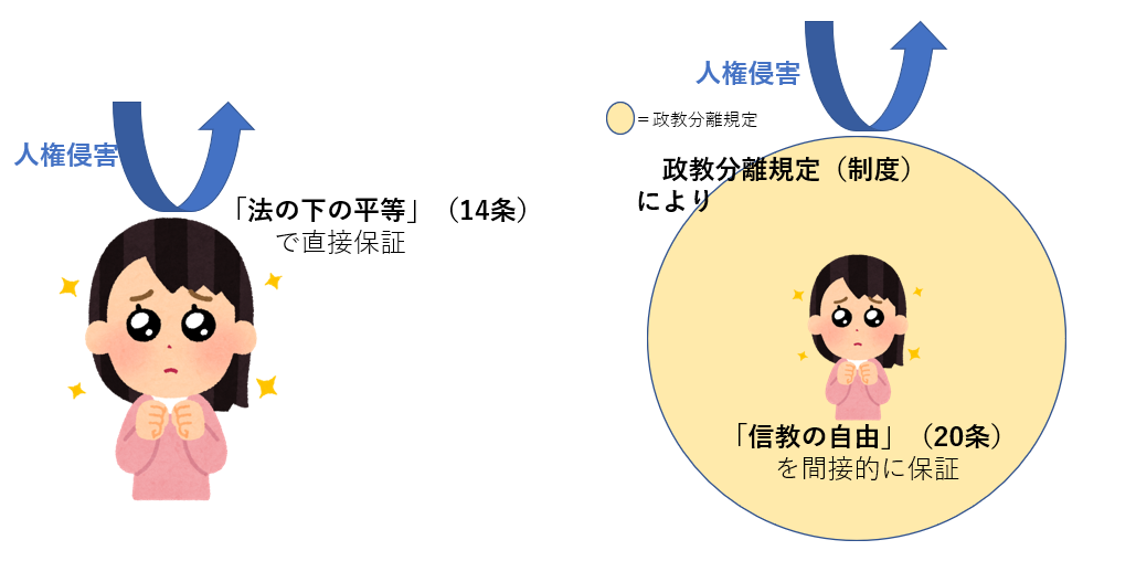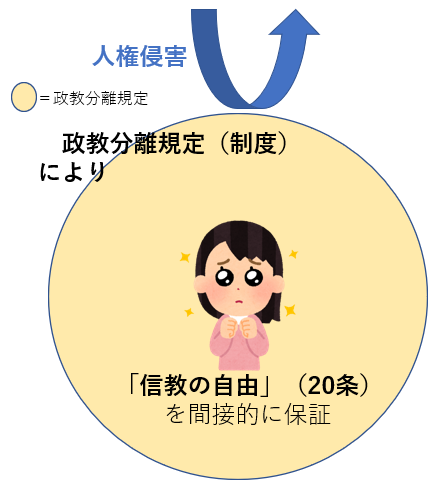 まさに、「政教分離規定」という制度・規定によって、「信教の自由」が間接的に守られてるでしょ?