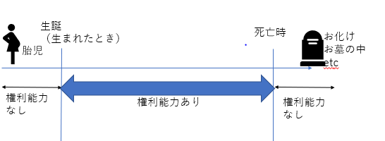要は「生まれてから死ぬまでの生きている間は権利能力あり」ということになります。