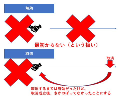 取消:取消するまでは有効だが、取消が成立した場合はさかのぼって最初からなかったことになる(無効)