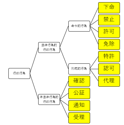 具体的に行政行為というのは→下命(かめい)・禁止・許可・免除・特許・認可・代理・確認・公証・通知・受理