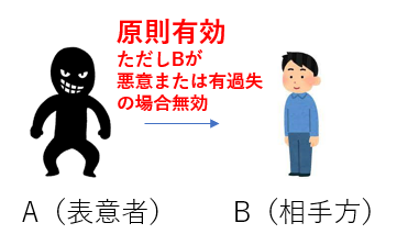 ただし心裡留保の場合は、Aだけが虚偽の表示をしているわけでBがそれを知らない(善意)だったりそんなこと知ることができない(無過失)だったり、