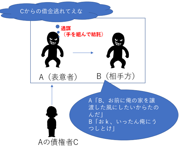 例えば、Aが債権者から差押えを免れるためBと結託して自宅の建物売買契約を締結するような場合です。
