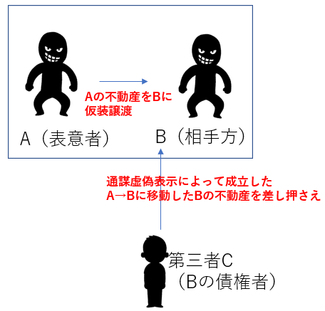 AB間で通謀して仮装譲渡が行われ、Aの不動産がBの不動産になったとします。