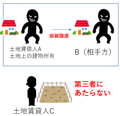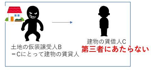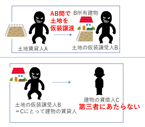 そのBが仮装譲渡された土地に建てた建物をCに貸します。(この場合、Bは建物賃貸人・Cは建物賃借人になるわけですね)